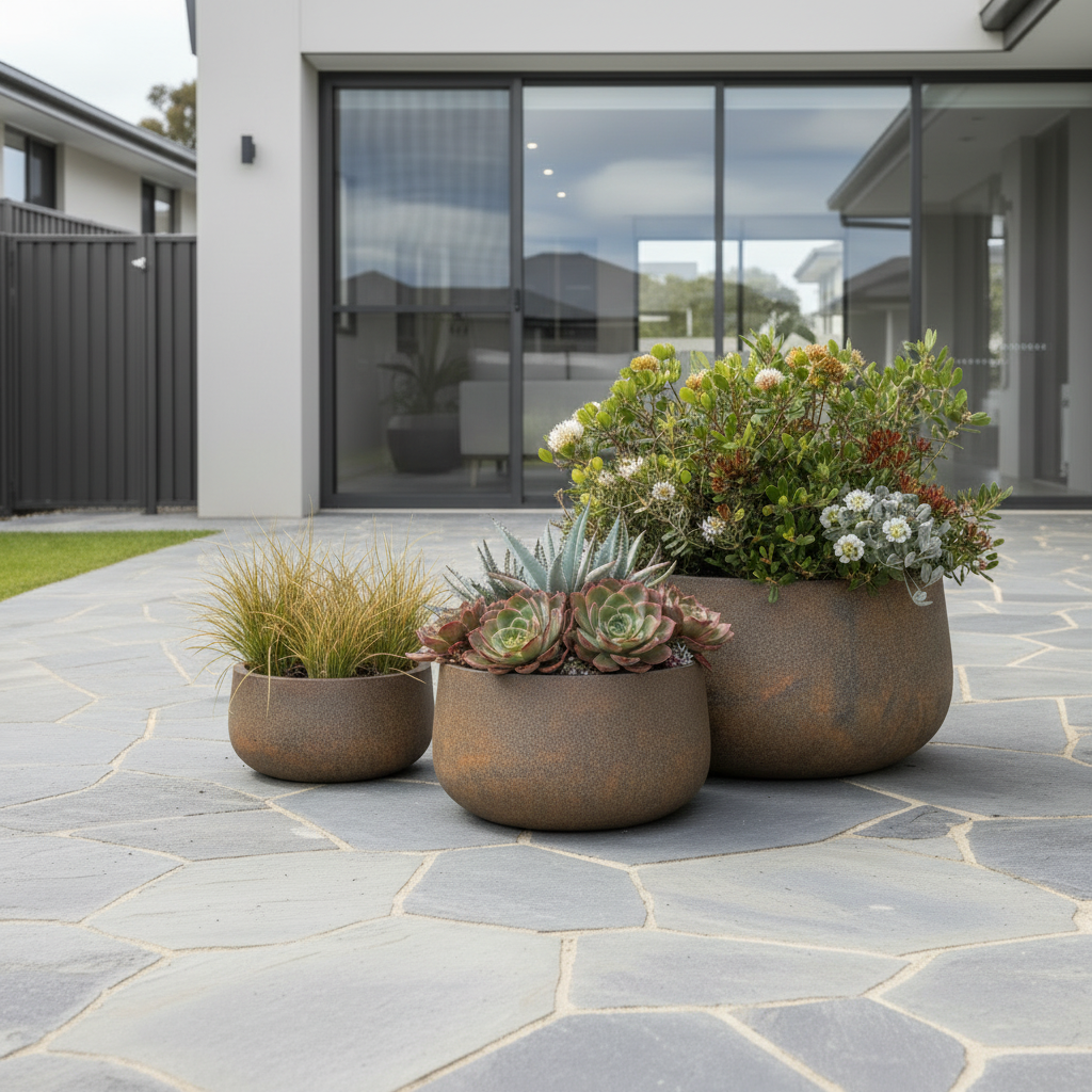 The rust-toned finish features subtle texture and natural variation, capturing the character of aged metal while remaining lightweight and weather-resistant. With its softly rounded silhouette, the Lunar Bowl Pot complements modern, rustic and minimalist gardens, making it ideal for statement plants, architectural greenery or layered planting designs.