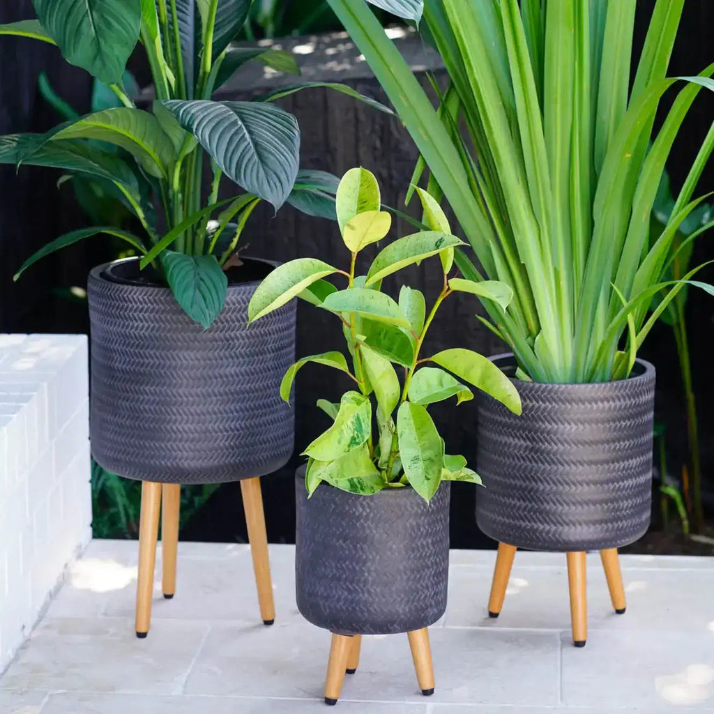 Stylish and Practical Design: The Bamboo Tripod Pot boasts a modern, round shape with a distinctive hatch textured finish. Set on sleek timber legs, it’s perfect for adding a touch of elegance to your space.